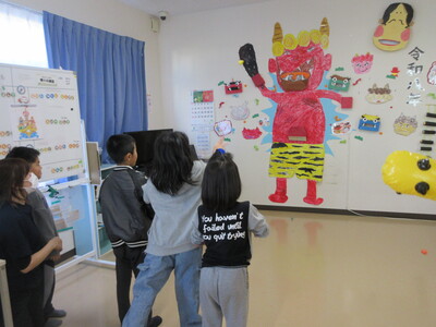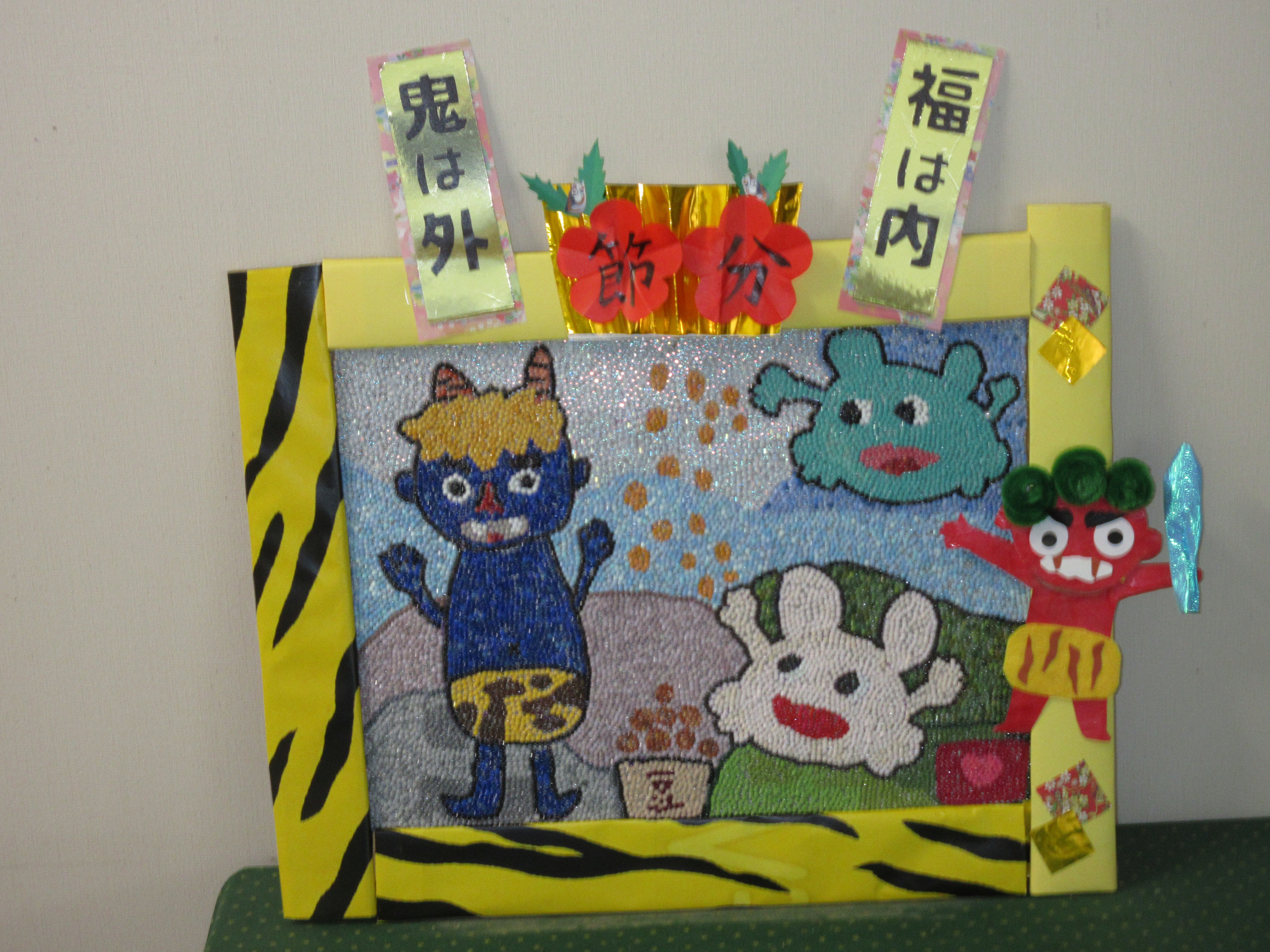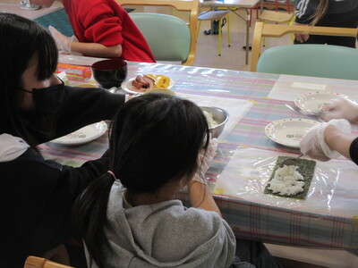 児童&在宅 2026.02.12 2月の節分イベント♪ 2月に入り、施設内は節分ムードになっています。 笑う門には福来る!事務所入り口では、生活介護利用者さんの作品がお出迎えしています(^^)/児童デイサービスでは、みんなで恵方巻を作りました。「ソーセージ入れたい!」「うまく巻けるかな」と、お互いに話しながら具材をのせていきました。恵方巻を食べたあとは、みんなで描いた鬼のイラストに向かって豆まきを行いました。各ポイントにある的をめがけ、みんなで思い切り投げて、大笑いしていました。